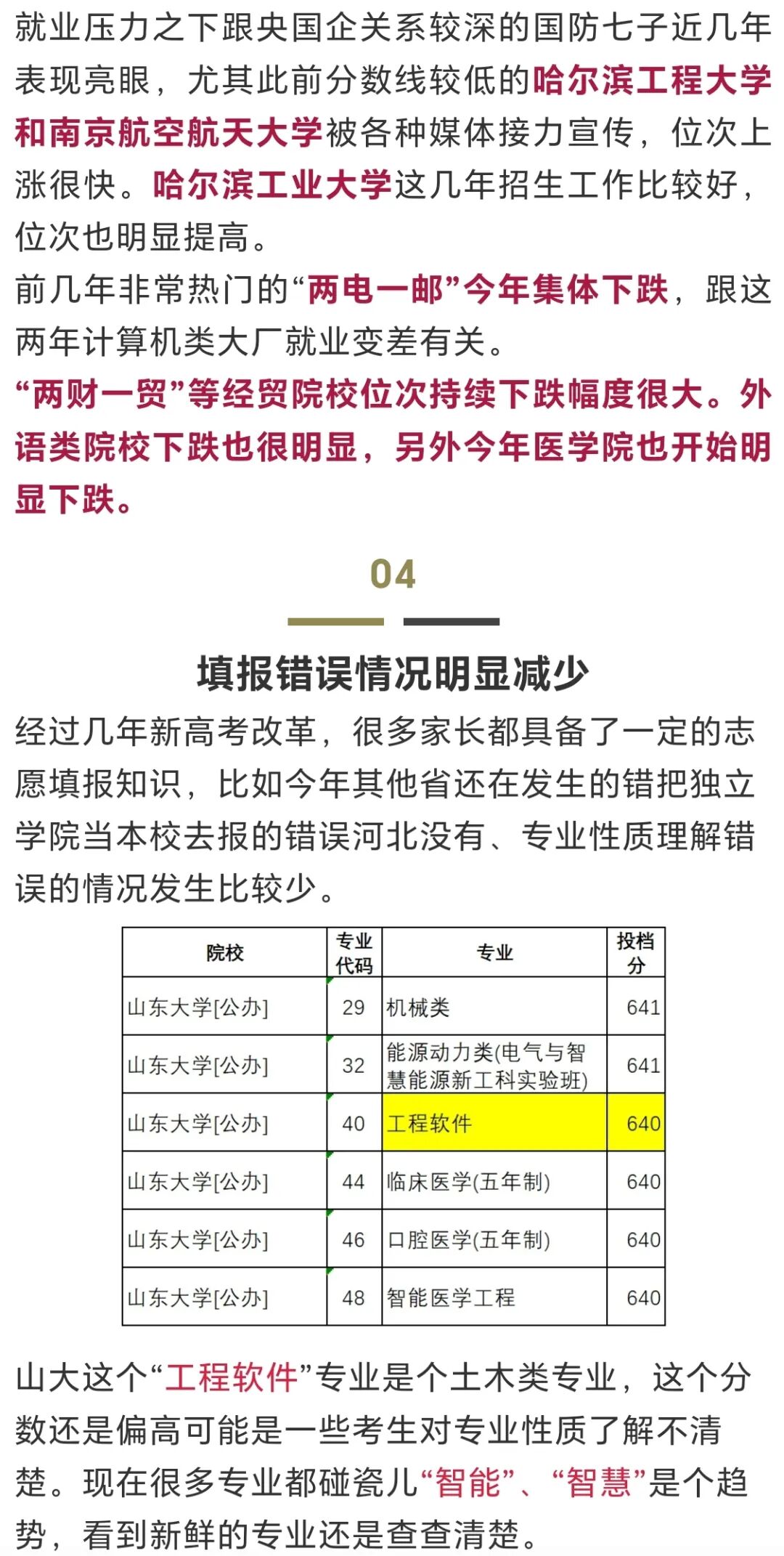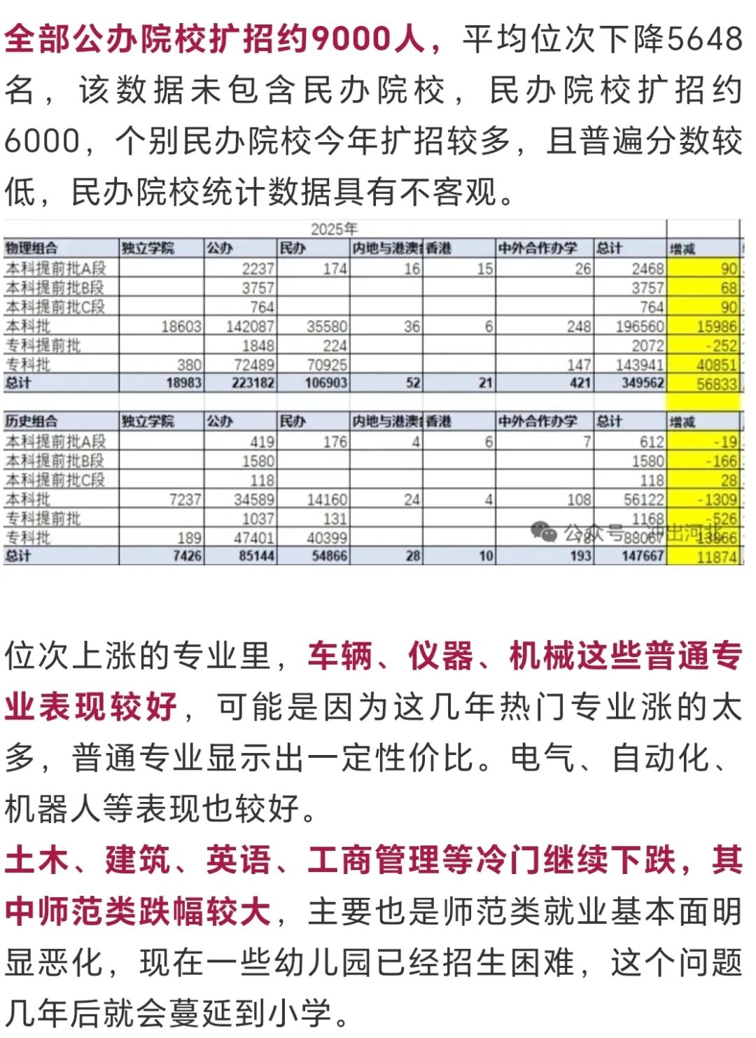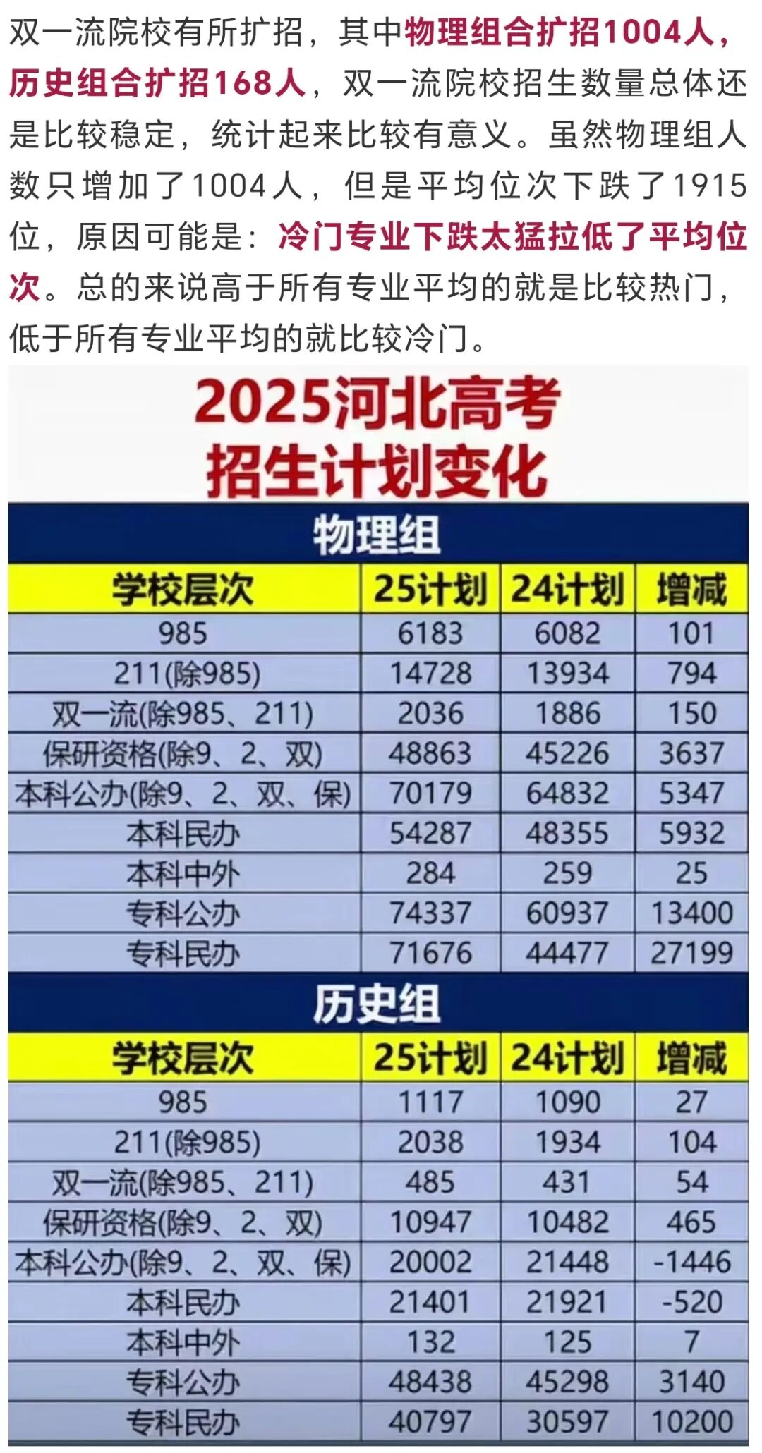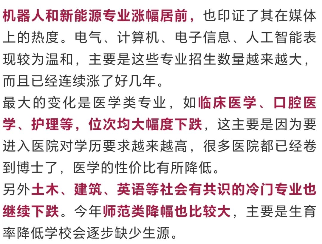 2025年河北省本科普通批录取主要特点总结如下: 1、计算机、电子、电气、自动化等热门专业表现温和,机器人和新能源涨幅居前。 2、土木和建筑继续下跌,医学类和师范类也加入了大幅下跌的行列。 01 物理组招生计划增长明显 计划数变化 ![]() 录取率 仅计算参加夏季普通高考的考生, 物理组合录取率:本科约56%,本专总约96%; 历史组合录取率:本科约24%,本专总约61%。 录取率物理组合远高于历史组合,这个差距为新高一学生选科提供了重要参考价值。 02 热门专业表现温和&医学专业暴跌 双一流院校 ![]() ![]() ![]() 全部公办院校 ![]() ![]() 03 国防七子热门&财经院校遇冷 ![]() ![]() 05 征集计划缺乏亮点 本科征集计划基本上是各种民办院校和独立学院,公办院校很少。 211院校只有河北工业大学应用化学,石河子大学植物生产类、农业资源与环境、延边大学食品科学与工程中外合作共4个名额征集。 专业+院校模式报志愿,出现捡漏的机会很少,不应对征集捡漏好学校有什么期望。 民办院校中保定理工学院物理组征集1457人,历史组征集597人;河北科技学院物理组征集1084人,历史组征集109人,数量都非常惊人。征集名额特别多的学校第一次征集也难以录取满,分数低于本科线的考生,如有兴趣可以关注本科第二次征集,今年本科二征志愿,降幅最大达60分,分数降幅较大的院校,往往就是学费较高,专业相对冷门,地理位置较远,交通不便利的院校居多。 06 地域热度比较分散 近几年因为就业整体不佳,考生对于大学地域的热情有所降低,更加关注专业和升学,当然一些偏远难就业的城市也依然不受欢迎,考生在大学地域的选择上比较分散,不像前几年经济好的时候主要追捧长三角、珠三角。 ![]() 07 中外合作有所遇冷 今年中外合作一方面继续扩招,另一方面由于留学生越来越多,回国就业越来越普通,造成整体有所遇冷。双一流院校中外合作平均下降3356位,全部公办院校下降8969位。 河北单招考试交流群 助力单招 ⭐ 封闭特训效果至上 ⭐ ⭐ 一线师资全科覆盖 ⭐ ⭐ 连续多年权威押题 ⭐