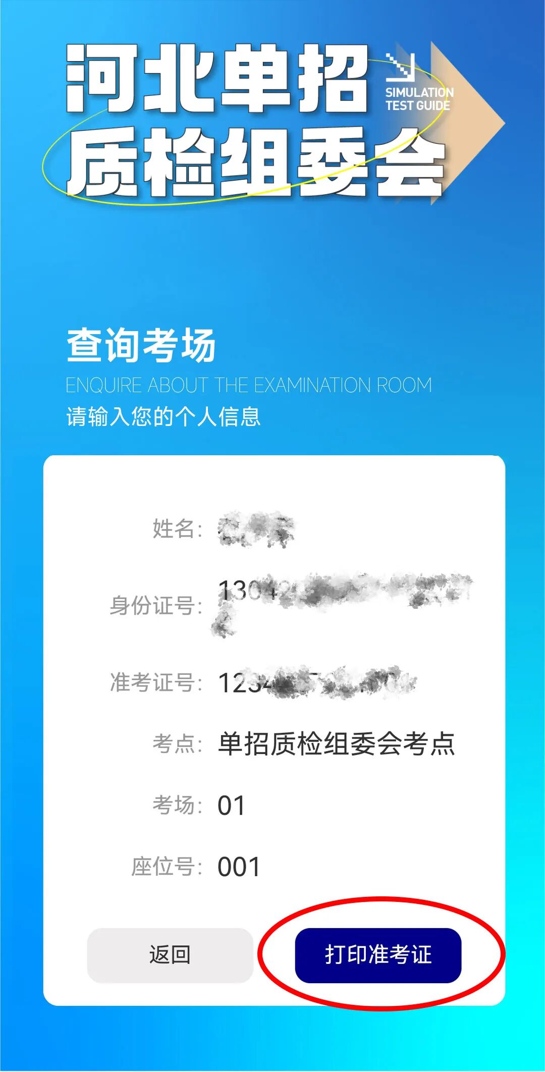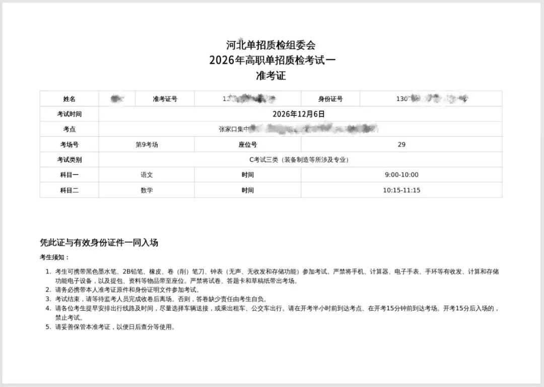 ![]() 2026届河北高职单招质检考试一准考证,12月3日12时起可打印。请已完成报名的考生,凭姓名和身份证号进入报名系统自行打印。准考证包含准考证号、考试时间、考点信息、座位信息等内容。 ![]() ①打开河北模拟质检平台首页 点击下方“模拟质检”→“报名通道” ![]() ②进入报名系统后,点击打印准考证 ![]() ③输入姓名、身份证号和验证码后,点击立即查询 ![]() ④核对个人信息,点击打印准考证 下载到手机/电脑保存准考证后进行打印 ![]() ⑤仔细阅读准考证上的内容,并打印出来 ![]() 一、自觉服从监考老师等考试工作人员管理,不得扰乱考场及其他考试工作地点的秩序,不得危害他人的身体健康和生命安全。 二、凭身份证、准考证按规定时间和地点参加考试。考生需自备草稿纸。 三、除身份证、准考证、2B铅笔、书写用0.5mm黑色签字笔、橡皮、草稿纸外,其他非必需物品不准带入封闭区和考场。 四、入场后,对号入座,将准考证放在课桌座号标签处以便核验。领到答题卡和试卷后,在指定位置和规定时间内准确、清楚地填涂个人信息。遇试卷、答题卡分发错误及试题字迹不清、重印、漏印或缺页等问题,应举手询问,开考前报告监考老师;开考后再行报告,延误的考试时间不予延长;涉及试题内容,不得向监考老师询问。 五、开考信号发出后才能开始答题,不得提前交卷出场。 六、考点按照北京时间统一发出信号或指令,考场内时钟仅供参考。 七、在与题号相对应的答题区域内答题,写在草稿纸上或非题号对应的答题区域的答案一律无效。 八、考场内须保持安静,不得吸烟,不得喧哗,不得交头接耳、左顾右盼、打手势、做暗号,不得夹带、旁窥、抄袭或有意让他人抄袭,不得传抄答案或交换试卷、答卷、草稿纸,不得传递文具、物品等,不得将试卷、答题卡或草稿纸带出考场。 九、考试结束信号发出后,立即停笔并停止答题,在监考老师依序收齐答题卡、试卷、草稿纸后,根据监考老师指令有序离开考场。 1.考生应在考试前20分钟进入考场,将准考证放置在桌面左上角。等待监考老师宣布考试注意事项、检查准考证、发放试卷等。 2.考场内实行单人、单桌考试,桌面左上角张贴考生考号或座号,离考场入口最近的一列最前排座号为本考场首考号。 3.监考老师宣布考场纪律,并开启试卷和答题卡。考生应先浏览试卷和答题卡,若发现科目错误、缺页、漏印、字迹不清、破损等,请举手报告监考老师。 4.考试开始时间到,监考老师宣布考试开始后,学生方可进行答题,否则按违规处理。 5.考试结束时,请立即放下笔。如继续答题,将按违规处理。将答题卡整理好,下面放试卷,最下面放草稿纸。整理好后静坐在自己座位上等待收取。 6.考试开始后15分钟,考生不允许再进入考场。 7.考试过程中及两科考试中间不允许离场。 8.考试期间不得将试卷及答题卡、草稿纸带出或传出考场。 9.严禁考生携带手机等通讯设备,以及手表、耳机、电脑等物品进入考场,避免影响正常考试。 10.考试均采取笔试方式,实行客观题型机读卡作答模式进行。 11.答题卡不能折叠、污损。 12.考生不得提前交卷出场。 河北单招考试交流群 助力单招 ⭐ 封闭特训效果至上 ⭐ ⭐ 一线师资全科覆盖 ⭐ ⭐ 连续多年权威押题 ⭐