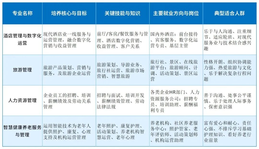 ![]() 招生计划就像一个专业的“人气风向标”。通常,招生人数多的专业,往往是当前社会需求量大、就业前景被看好的领域。考试五类中,酒店管理与数字化运营、旅游管理、人力资源管理、智慧健康养老服务与管理,这几个专业的招生计划最多。它们分别代表了数字化转型、体验经济、组织管理和银发经济等不同方向。 ![]() ![]() 注:专业名称相同,但不同括号注解、中外合作办学、订单班的不累计。不含征集志愿计划。 ![]() 前景与挑战:酒店业是永不消失的行业,数字化运营是明确趋势。职业路径清晰,但通常需要从一线岗位开始,直接面对客户,对沟通能力和抗压能力是考验。一些院校与高端酒店集团有合作,实习和就业有保障。 如何选择:问自己是否喜欢规律中带有多样性的工作,能否优雅地处理客户投诉。如果答案是肯定的,并且你对管理一家酒店的运营细节充满好奇,这个专业值得考虑。 前景与挑战:旅游业复苏势头明显,且不断与教育、文化等融合,产生如“研学旅行指导师”等新岗位。工作季节性较强,可能需要经常外出。除了传统旅行社,现在可转向线上旅游平台、文旅项目策划等。 如何选择:你是否是一个“活地图”和“百事通”,乐于分享并策划行程?是否愿意不断学习新知识来丰富讲解?如果是,你的热情能在这个行业得到很好发挥。 前景与挑战:任何规模的企业都需要HR,岗位需求稳定。职业发展通道(专员-经理-总监)清晰,越老越吃香。但初期工作可能涉及较多事务性内容,需要极高的保密意识和沟通情商。 如何选择:你被认为是朋友中值得信赖、善于倾听和调解矛盾的人吗?你是否对“如何激发人的潜力”这类话题感兴趣?如果是,你具备从事HR工作的潜在特质。 前景与挑战:在人口老龄化趋势下,这是前景广阔的“朝阳行业”。行业正从传统照护向“智慧康养”升级,技术应用能力变得重要。工作成就感高,但需要极大的爱心、耐心和责任感。 如何选择:与老人相处时,你更多的是感到耐心还是急躁?你是否愿意学习使用智能设备来提升老人生活质量?选择这个专业,需要人文关怀与技术应用能力并重。 来源:河北模拟质检整理 河北单招考试交流群 助力单招 ⭐ 封闭特训效果至上 ⭐ ⭐ 一线师资全科覆盖 ⭐ ⭐ 连续多年权威押题 ⭐