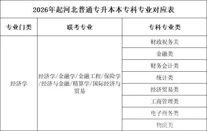 根据河北专升本政策,单招专科生大三时可报名参加全省统一专升本考试,通过后即可升入本科院校。 为帮大家提前规划,我们整理了《河北普通专升本本专科专业(类)对照表》。无论你是单招备考萌新,还是在读专科生,这份对照表都能帮你理清升本路径,少走弯路! ![]() 河北省教育厅公布《关于优化调整河北省普通专升本考试科类及科目设置的通知》,调整后,河北普通专升本由原来的八大类变为十大专业门类,分别为:经济学类、管理学类、理工类、农学类、教育学类、文学类、法学类、历史学类、医学类、艺术类。具体专科专业类对应的本科联考专业如下: ![]() ![]() ![]() ![]() ![]() ![]() ![]() ![]() ![]() ![]() 2026年起,河北专升本考生按照所学专科(高职)专业,须严格按照选择相对应的专业(联考专业)。举例:考生专科所学专业为机电一体化技术,所属自动化类,按照《普通专升本考试本专科专业(类)对照表》,可对应报考理工2、理工3、理工4三个学科门类对应联考专业中的任意一个专业。 将来有专接本打算的单招同学们,可以参考此表,提前明确目标专业,为未来的升学之路全力备考。 ![]() ↓ 扫码咨询老师 ↓ ![]() 河北单招考试交流群 助力单招 ⭐ 封闭特训效果至上 ⭐ ⭐ 一线师资全科覆盖 ⭐ ⭐ 连续多年权威押题 ⭐